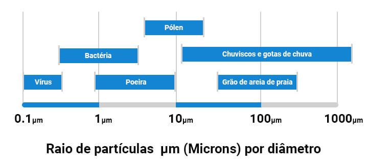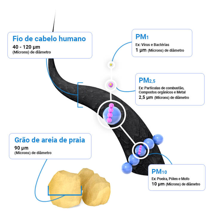 As partículas com menos de 2.5 micrômetros de diâmetro, também conhecidas como partículas finas ou PM2.5, representam o maior risco para a saúde, pois ao serem inaladas podem desencadear reações alérgicas, rinite, sinusite, asma e problemas respiratórios em geral.